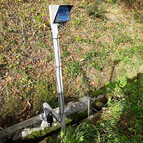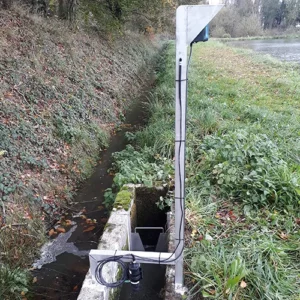 The data of the level sensors such as LNU06V4 or LNR06V4 are retrieved on the display by a Modbus connection. It is necessary to press the bottom push button to display the data. Up to 4 screens are available to display the values (height, flow, volume, rainfall). Those can be configured using the Avelour software.